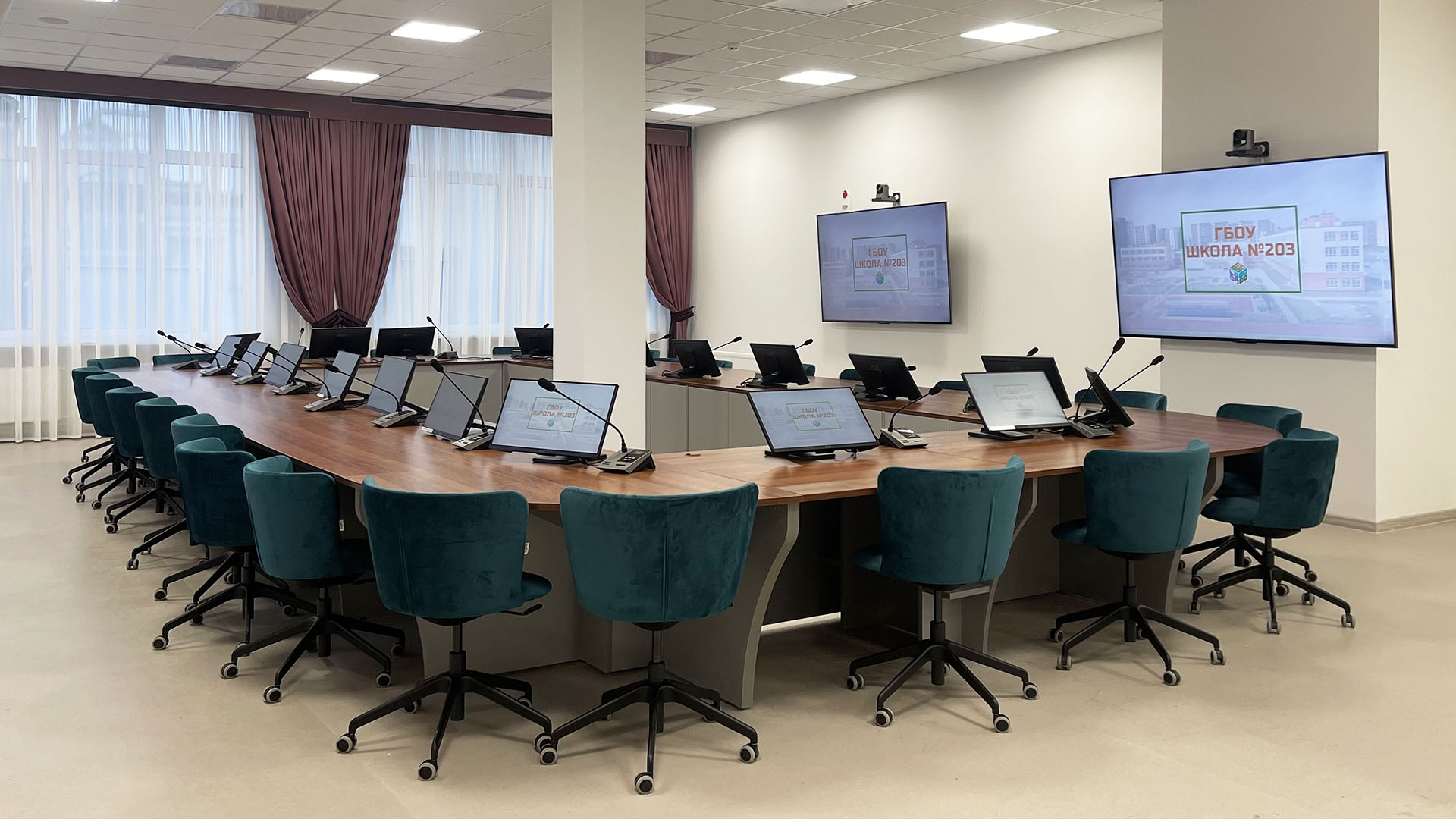 Конференц-зал был спроектирован как многофункциональное пространство, поддерживающее презентационные, дискуссионные и трансляционные форматы работы. Система отображения реализована на базе крупноформатных ЖК-панелей Xiaomi и интерактивной панели Lumien, что позволяет эффективно работать как с презентациями, так и с интерактивным контентом. Для проведения совещаний и обсуждений внедрена цифровая конференц-система с пультами председателя и делегатов, индивидуальными конференц-мониторами и централизованным управлением.